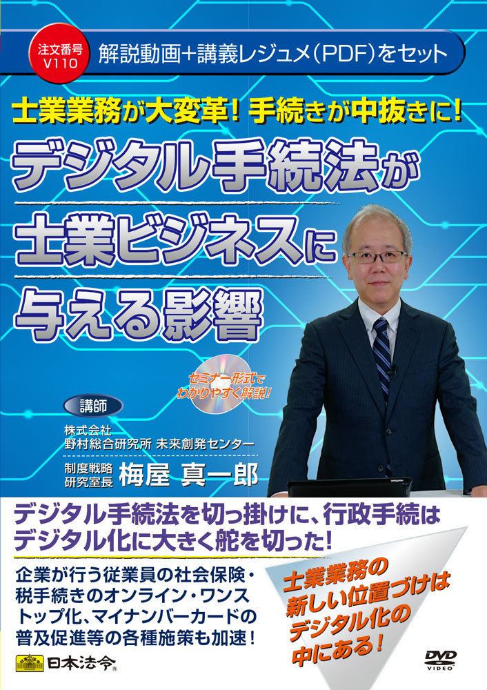 デジタル手続法をきっかけに、行政手続はデジタル化に大きく舵を切りました。企業が行う従業員の社会保険・税手続きのオンライン・ワンストップ化や、マイナンバーカードの普及促進などの新たな動きが本格化してきています。これらの動きにより、手続き業務を行う社労士や税理士などの士業ビジネスは非常に大きな影響を及ぼすことが想定され、大きな転換期となっています。そこで本DVDでは、デジタル手続法の基本事項と、この法令に連動する各種関連法・施策がどのような動きになっているのかを解説し、また、士業ビジネスの未来はデジタル・オンライン化の中でどのような役割を担うことになるのかを解説しています。