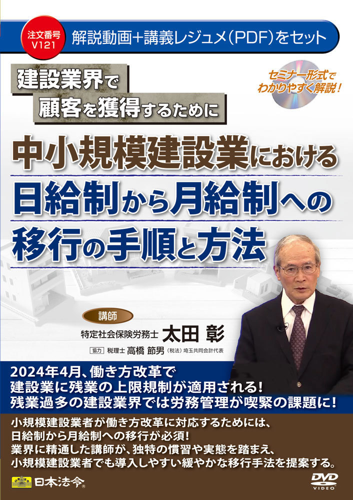 そこで、本DVDでは、建設業の現状や、月給制に移行できない理由、思い込みによる間違った対応などを明らかにし、月給制に移行するために、どのようにすればいいのかを解説しています。また、前年度の売り上げや人件費などを用いて経費面でのシミュレーションし、経営的視点を踏まえて、月給制をした場合の予測ができるようになっており、個々については、個人ごとに仮月給を設定して経営計画を立てることができるエクセルシートが付属しています。