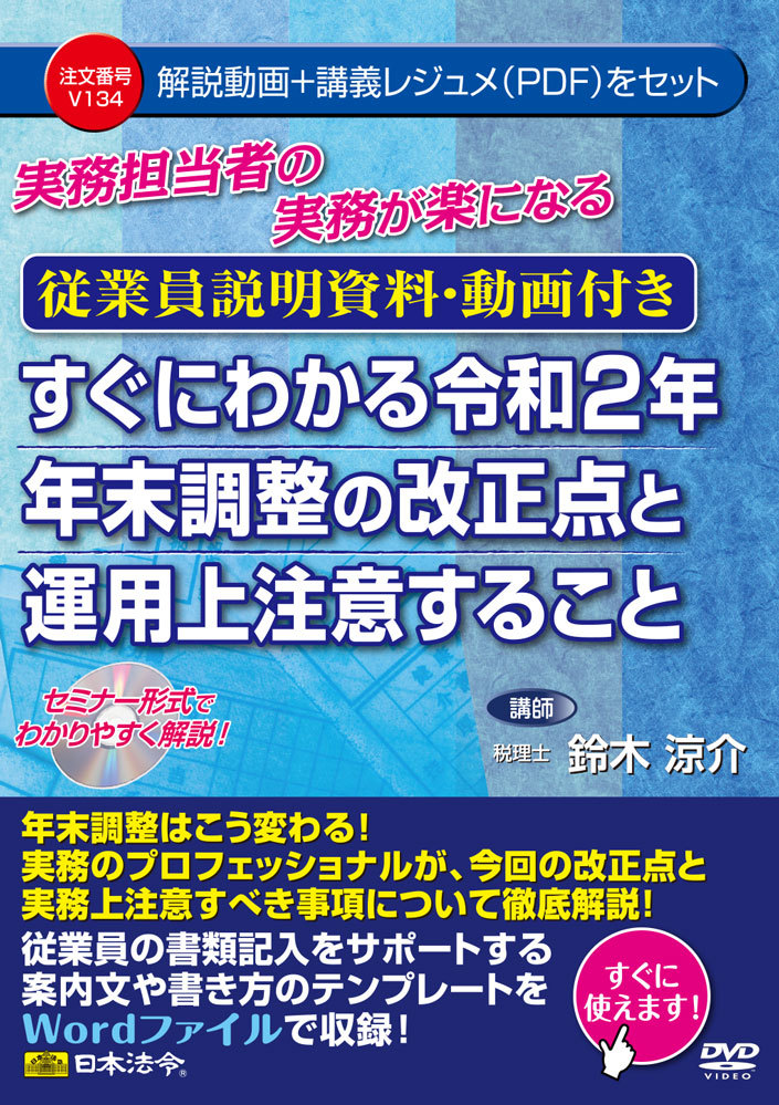 本DVDは、2枚組となっており、1枚目は、年末調整実務担当者向けに、令和2年の年末調整における「改正点の内容」、「電子化手続きに関すること」、「運用上注意するべき点」について解説した内容になっています。