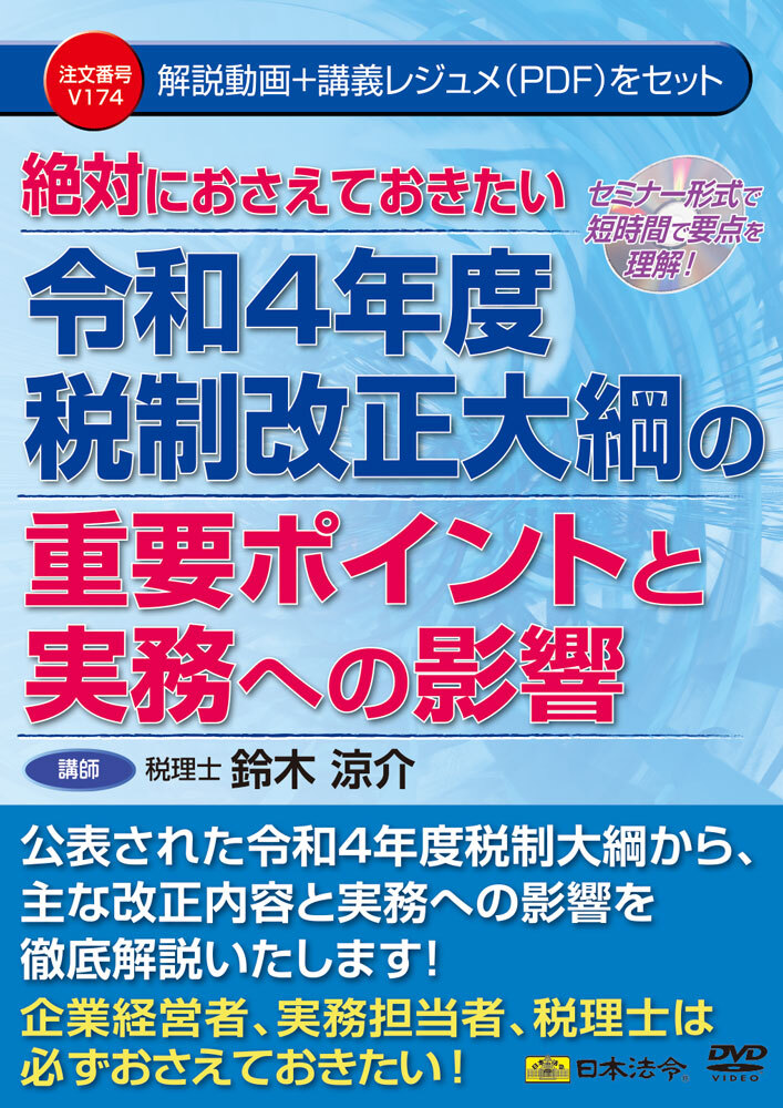 本DVDでは、企業の経営者、実務担当者、税理士向けに、令和4年度税制改正大綱の主だった内容と実務のどこに影響があるのかを解説しております。