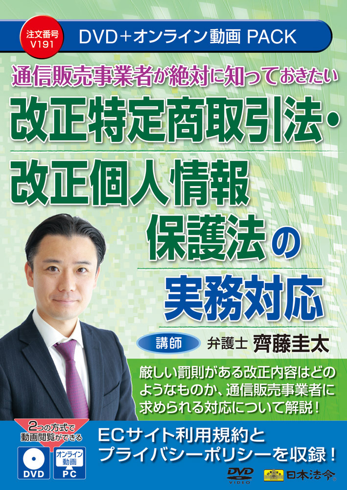 本DVDでは、特定商取引法の改正と個人情報保護法の改正のうち、通信販売事業者にとって大きな影響がある内容について解説し、事業者が対応しなければいけない事項がわかるような構成になっています。通信販売事業者が、作成や変更に苦労する通信販売の利用規約やプライバシーポリシーについて、雛形の書式も収録しています。