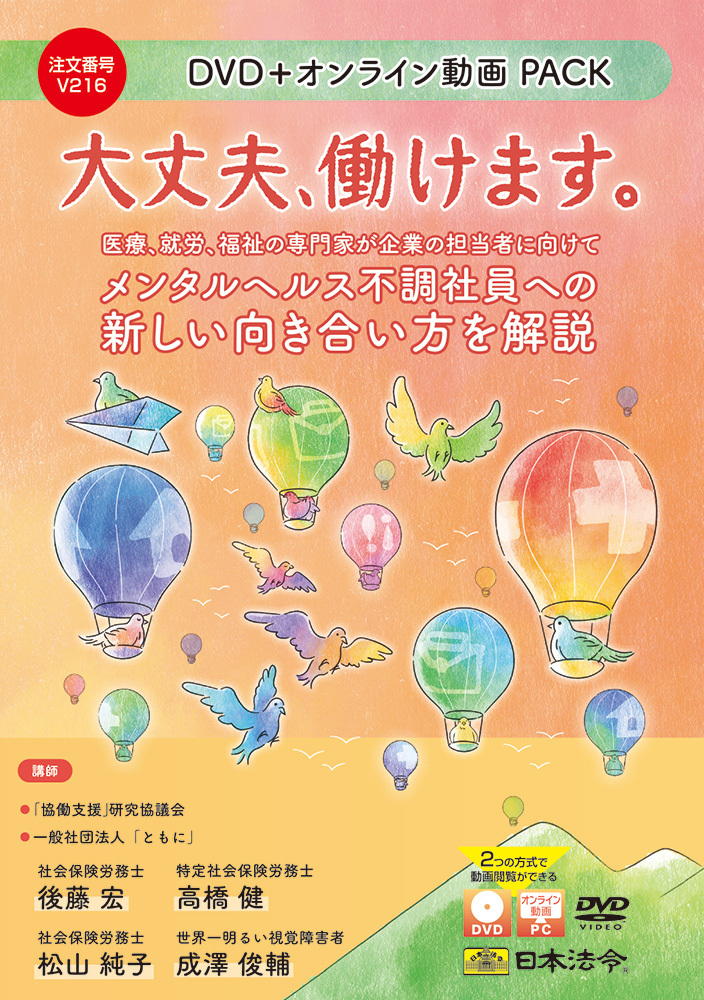 40年後の2065年には労働力率が50%になるといわれており、2030年には労働需要に対して644万人不足する推計結果も出ています。一方で様々な事情で就労が困難な方は3,000万人いるといわれており、その就労が困難な方の中でも、メンタルヘルス不調者などの「こころの病気」の比率が多くなっています。本DVDは、メンタルヘルス不調になったAさんの事例をベースに、企業の人事担当者や顧問社労士に向けて、どのタイミングでどのような支援が必要であり、どのような配慮をしていけばよいのかを、社会保険労務士の「一般社団法人ともに」のメンバーが整理し解説しています。また、医療、就労、福祉などの様々な専門家の視点から、必要な知識や支援・配慮のポイントなど、対談を交えて解説しています。