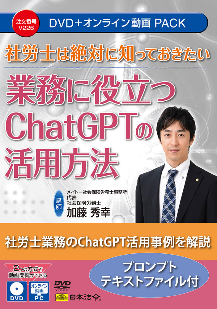 そこで、このDVDでは、社会保険労務士が生成AIのChatGPTを利用するにあたり、どういったことに注意が必要か、どのような業務での活用ができるのか、プロンプトの設定はどのようにしたらよいのかを、社会保険労務士に関連した業務の具体例を挙げて解説しています。