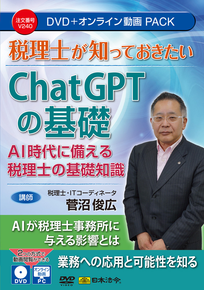 本DVDでは、東京税理士会デジタル化委員会の委員を務め、またITコーディネータでもある講師が、ChatGPTをはじめとした生成AIの基礎知識から、生成AIが税理士業務に与える影響、さらにどのように活用できるのかについて、わかりやすく解説しています。