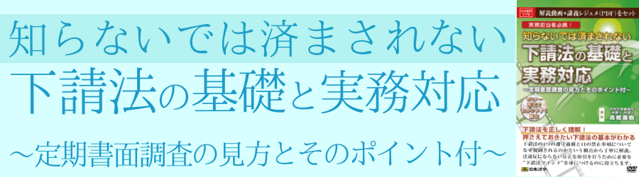 本DVDは、下請法の基礎的な概要説明から、下請法遵守の基本となる親事業者の4つの義務と11の禁止事項について、万一立ち入り検査の連絡が来たときに、実際の件はどういう流れになるのか、またどのような準備をしたらいいのか、そして検査官はどういうところを見ているのか等、事例を交え解説したものになります。