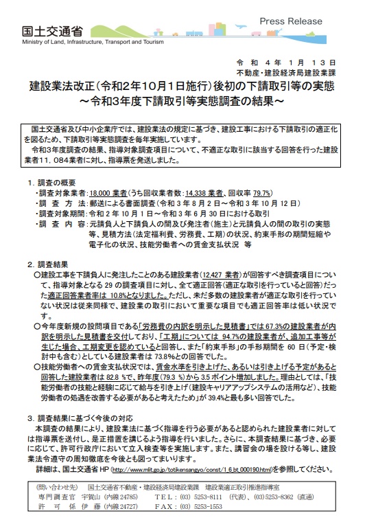 国土交通省は、建設業法改正(令和2年10月1日施行)後、初の下請取引等の実態調査結果を公表しました。