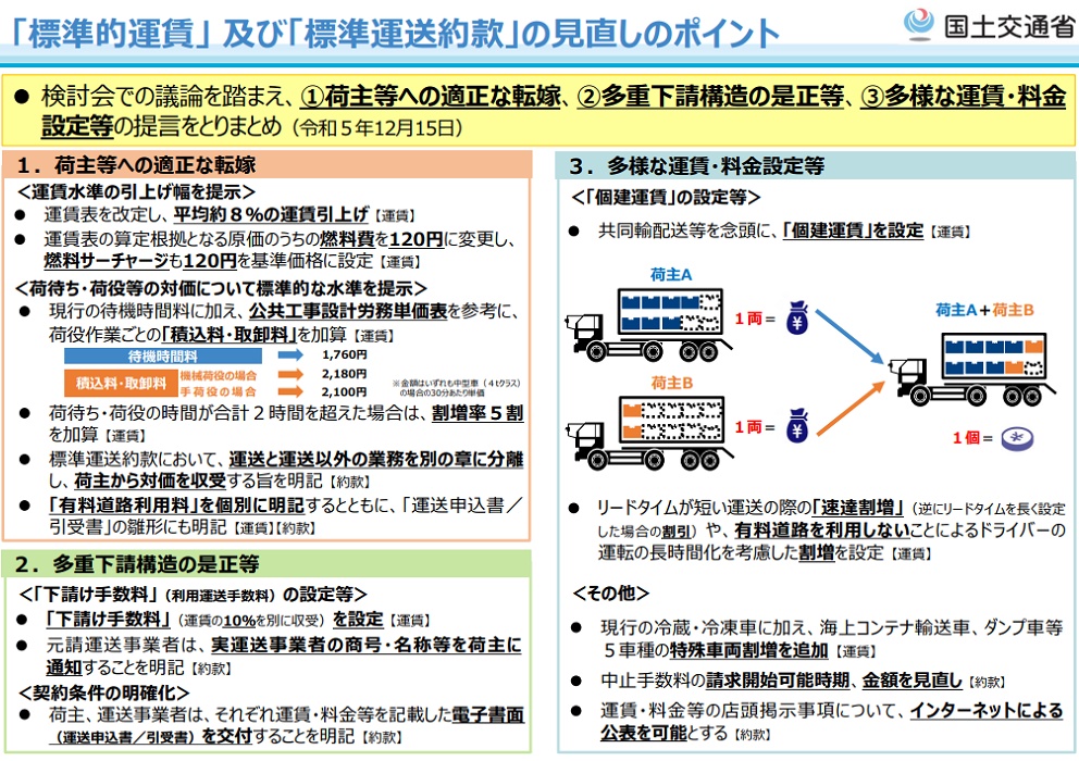国土交通省は、標準的な運賃・標準運送約款の見直しに向けた検討会の提言を公表しました。