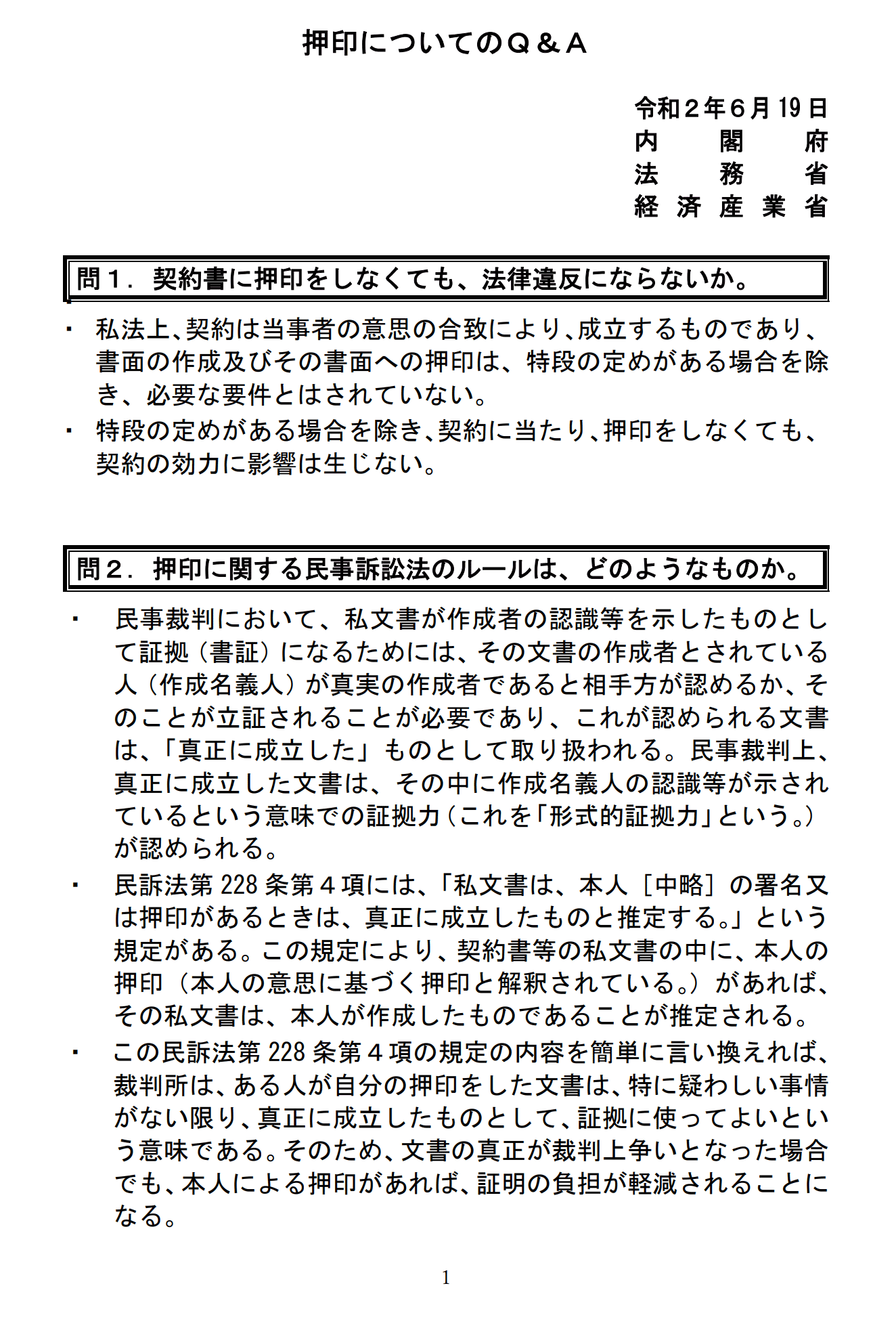 押印についてのQ&A公開(内閣府/法務省/経済産業省)