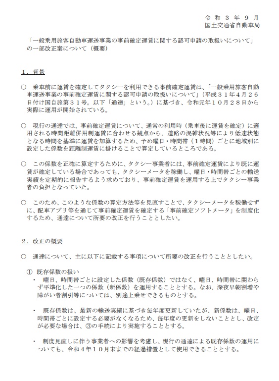 国土交通省は、タクシーメータを稼働せずに配車アプリ等を通じて事前確定運賃を確定する「事前確定ソフトメータ」を制度化するため、通達について所要の改正を予定しています。
