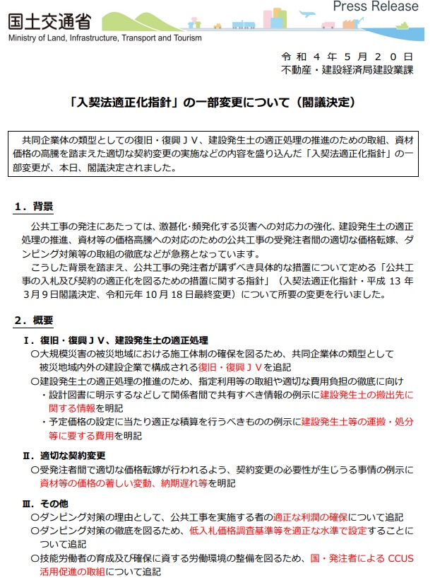 これらを踏まえ、公共工事発注者が講ずべき具体的な措置について定める「公共工事の入札及び契約の適正化を図るための措置に関する指針」について所要の変更が行われました。