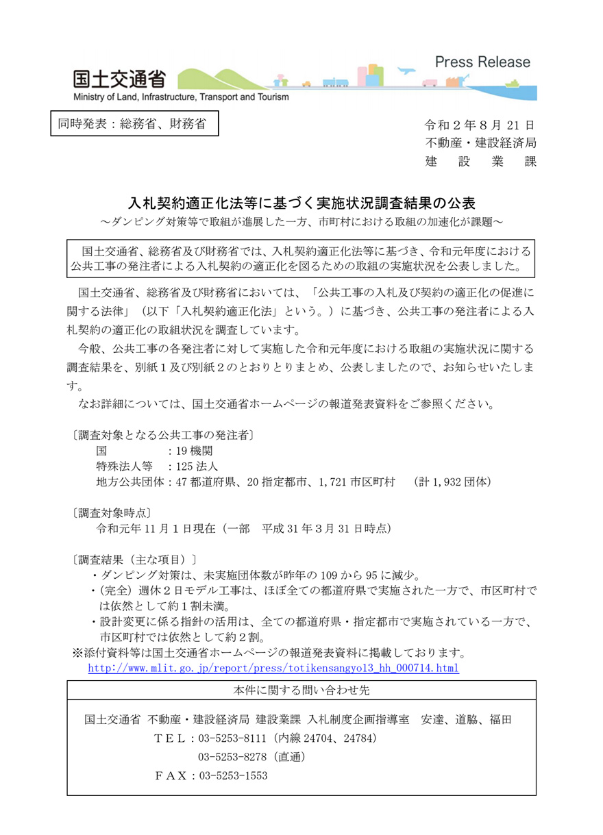 国土交通省、総務省及び財務省は「公共工事の入札及び契約の適正化の促進に関する法律」(以下「入札契約適正化法」)に基づき、令和元年度における公共工事の発注者による入札契約の適正化を図るための取組の実施状況を公表しました。