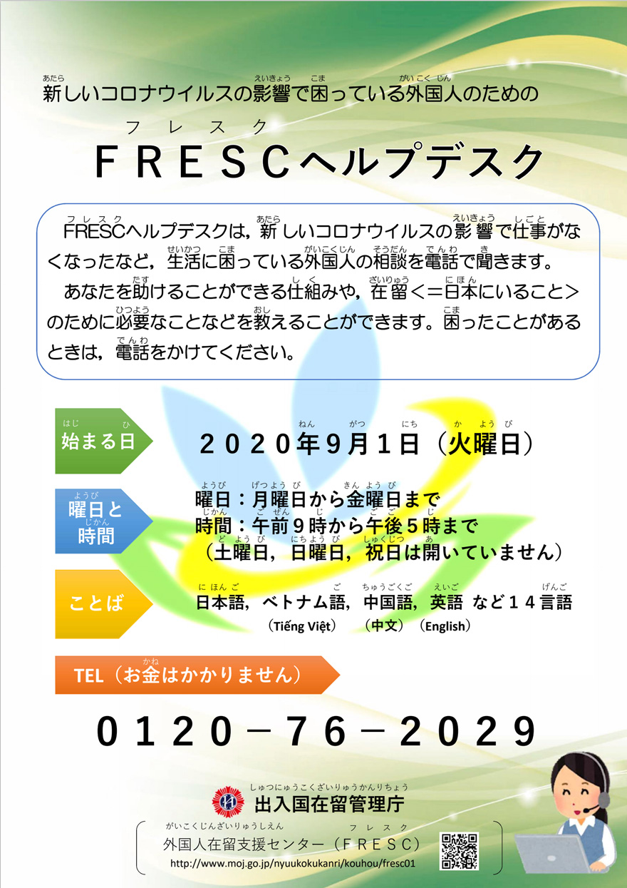 外国人在留支援センター(FRESC)は9月1日、技能実習生や留学生等を対象とした多言語・フリーダイヤルによる専用ヘルプデスクを設置、元技能実習生等が抱える問題についての相談に応じ、確実に問題解決できるよう支援を開始しました。