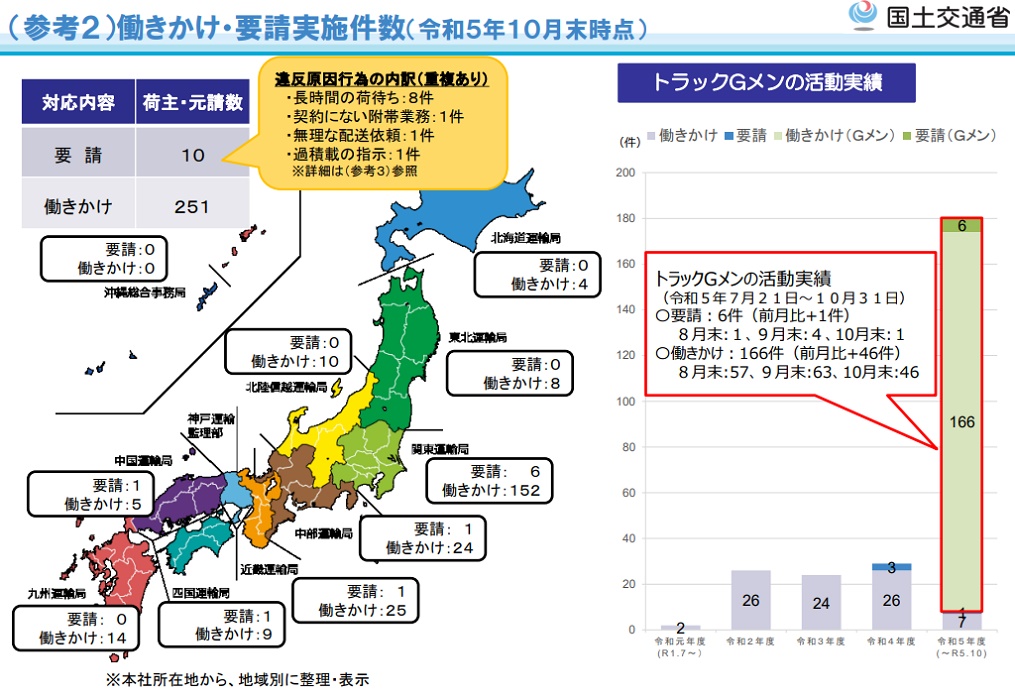 令和5年10月末時点のトラックGメンの活動実績は、貨物自動車運送事業法附則に基づく「働きかけ」を251件、「要請」を10件と、月当たりの平均実施件数は、発足前の1.8件から57件と大幅に増加しています。