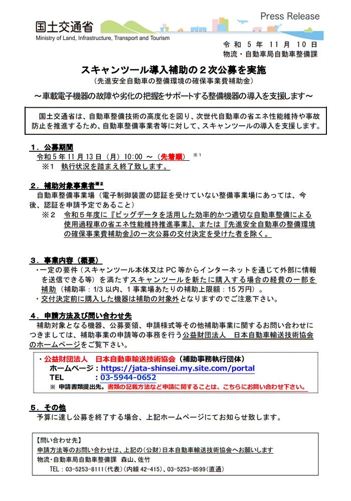 国土交通省は、自動車整備技術の高度化、省エネ性能維持、事故防止推進のため自動車整備事業者等に対して、スキャンツール(車載電子機器の故障や劣化の把握をサポートする整備機器)導入支援の2次募集を開始しました。