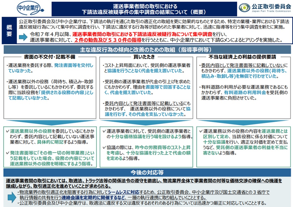 公正取引委員会および中小企業庁は、令和7年4月以降、運送事業者間の取引における下請法違反被疑行為について集中調査を行い、運送事業者に対して、2件の勧告、530件の指導を行いました。