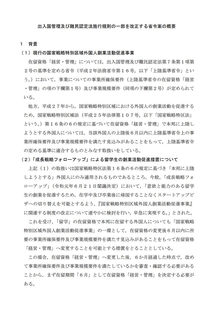 そのため入管法施行規則を一部改正して、入管法施行規則第3条の規定に基づく入管法施行規則別表第2の「経営・管理」の項の下欄に「6月」を加えることで、「留学」の在留資格で在留する外国人が、「国家戦略特別区域外国人創業活動促進事業」の一環として、入管法の規定に基づき在留資格「経営・管理」へ変更する場合にも在留期間「6月」とすることが可能となります。