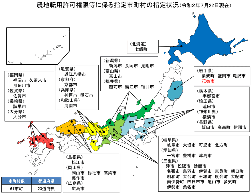 都道府県に代わり農地転用許可等の権限を行使する市町村について、7月に新たに花巻市(岩手県)が指定され、これにより全国で61市町が指定市町村となりました。