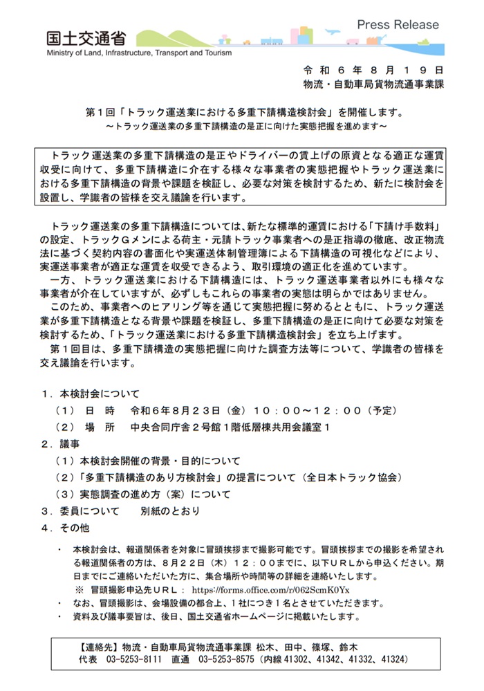 第1回「トラック運送業における多重下請構造検討会」を開催します。(国土交通省)
