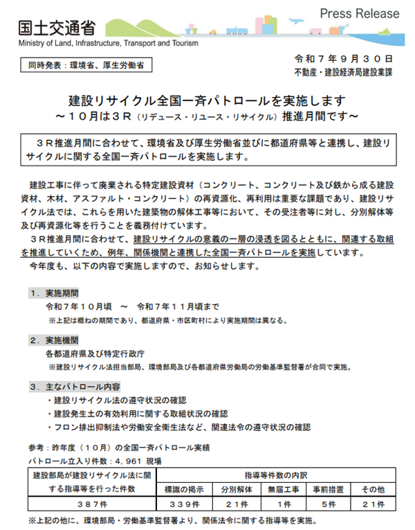 3R推進月間に合わせて、環境省及び厚生労働省並びに都道府県等と連携し、建設リサイクルに関する全国一斉パトロールが実施されます。