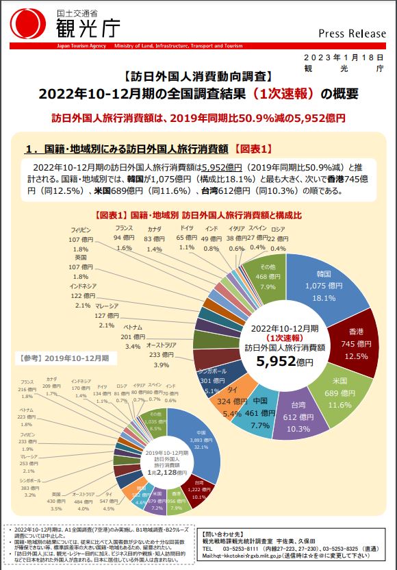 観光庁は、訪日外国人の消費動向調査2022年10-12月期(1次速報)を公表しました。