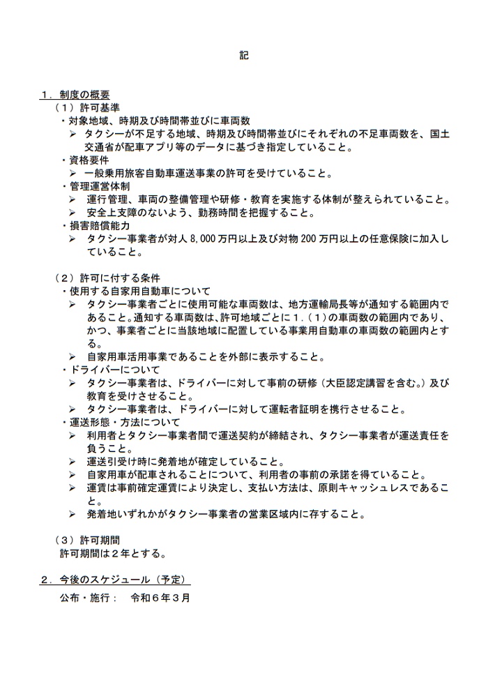 国土交通省は、地域の自家用車や一般ドライバーが有償で運送するサービス(自家用車活用事業)の提供を可能とする許可の取扱いについてパブコメを開始しました。