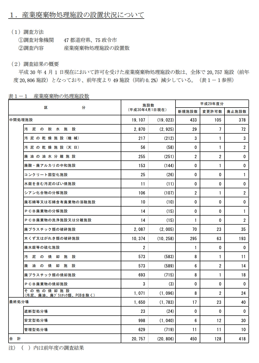 1.産業廃棄物処理施設の設置状況(平成30年4月1日現在)