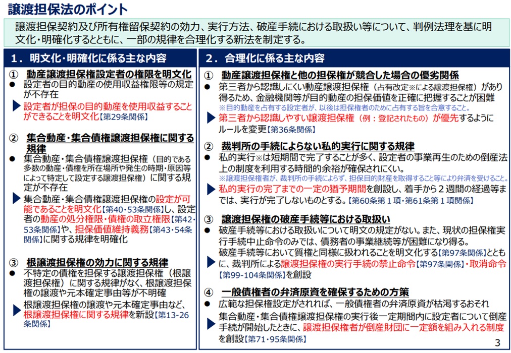 譲渡担保法は、これまで法令に明文の規定がなかった動産や債権等を目的とする譲渡担保契約、所有権留保契約の効力、譲渡担保権、留保所有権の実行、破産手続等における権利の取扱い等を定めています。