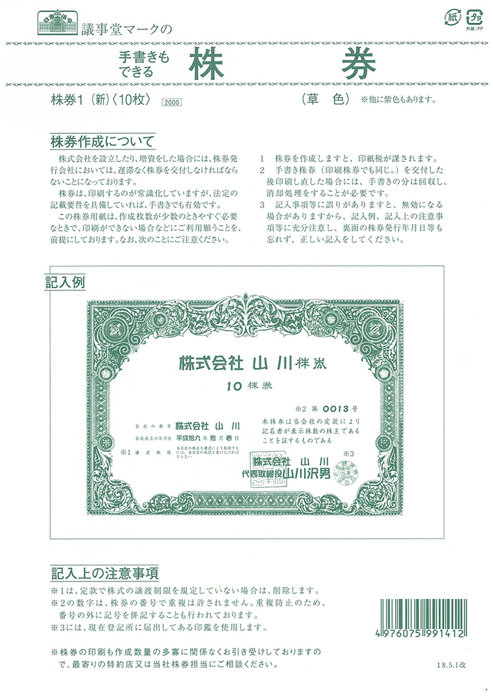 本商品は、必要事項をご記入いただきお使いいただける株券です。印刷の色は草色です。 【注意事項】こちらの商品は用紙サイズがB5別寸(188mm<タテ>×262mm<ヨコ>)となりますため、若干B5サイズよりも大きくなっております、ご注意ください。