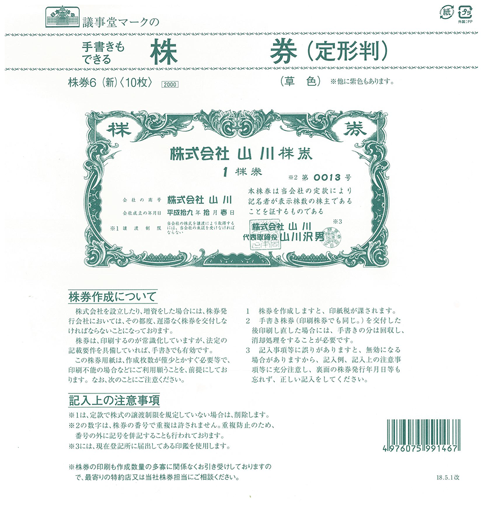 本商品は、必要事項をご記入いただきお使いいただける株券です。用紙サイズは定型判(107mm<タテ>×210mm<ヨコ>)、印刷の色は草色です。