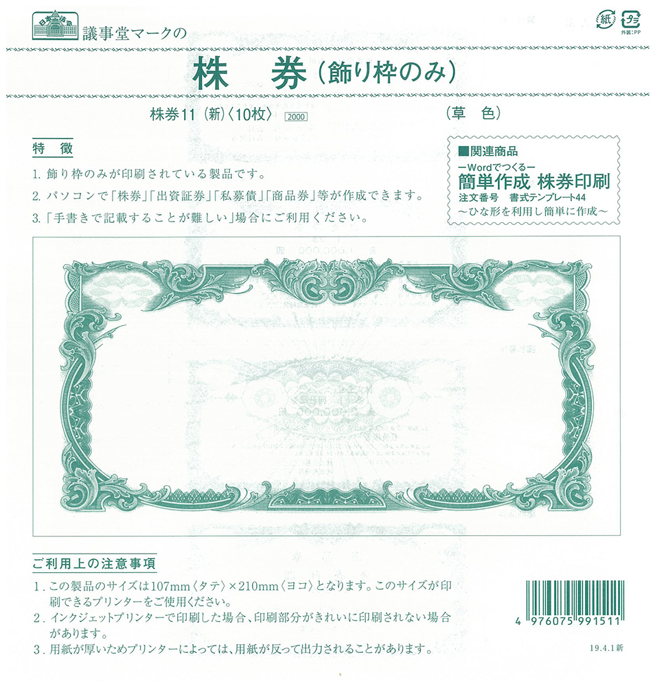 飾り枠のみが印刷されている商品です。パソコンで「株券」「出資証券」「私募債」「商品券」等が作成できます。「手書きで記載することが難しい」場合にご利用ください。 【ご利用上の注意事項】用紙サイズが107mm<タテ>×210mm<ヨコ>となりますため、このサイズが印刷できるプリンターをご使用ください。インクジェットプリンターで印刷をした場合、印刷部分がきれいに印刷をされない場合があります。用紙が厚いためプリンターによっては、用紙が反って出力されることがあります。