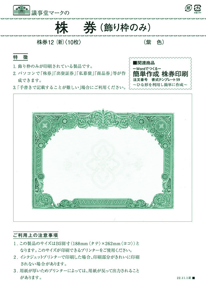 「Wordでつくる 簡単作成 株券印刷」(書式テンプレート59)で、パソコンから簡単に印刷ができます!