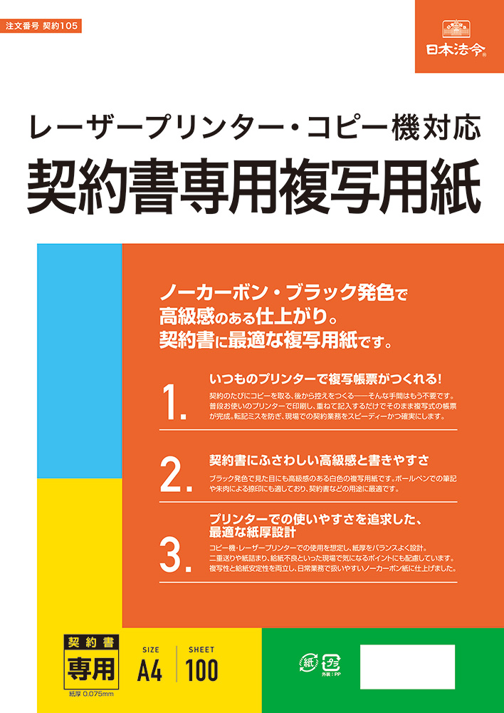 いつものプリンターで、複写式の契約書がそのまま作成できるノーカーボン複写用紙です。
