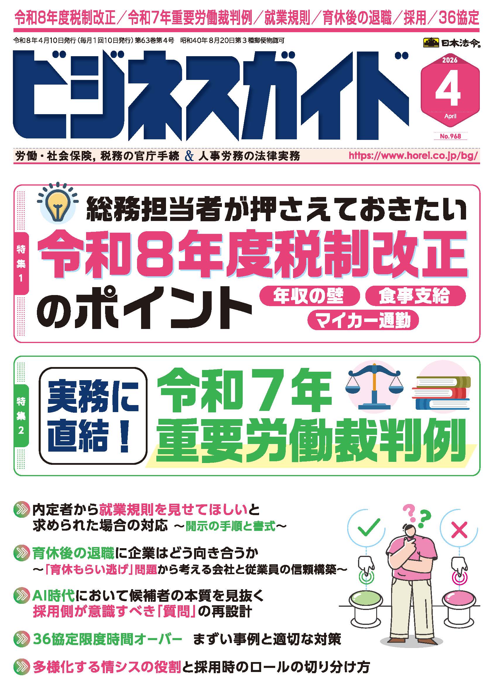 企業の総務・人事の実務担当者および社会保険労務士の業務に直接影響する、労働・社会保険、労働法等の法改正情報等や実務への影響をいち早く提供しています。