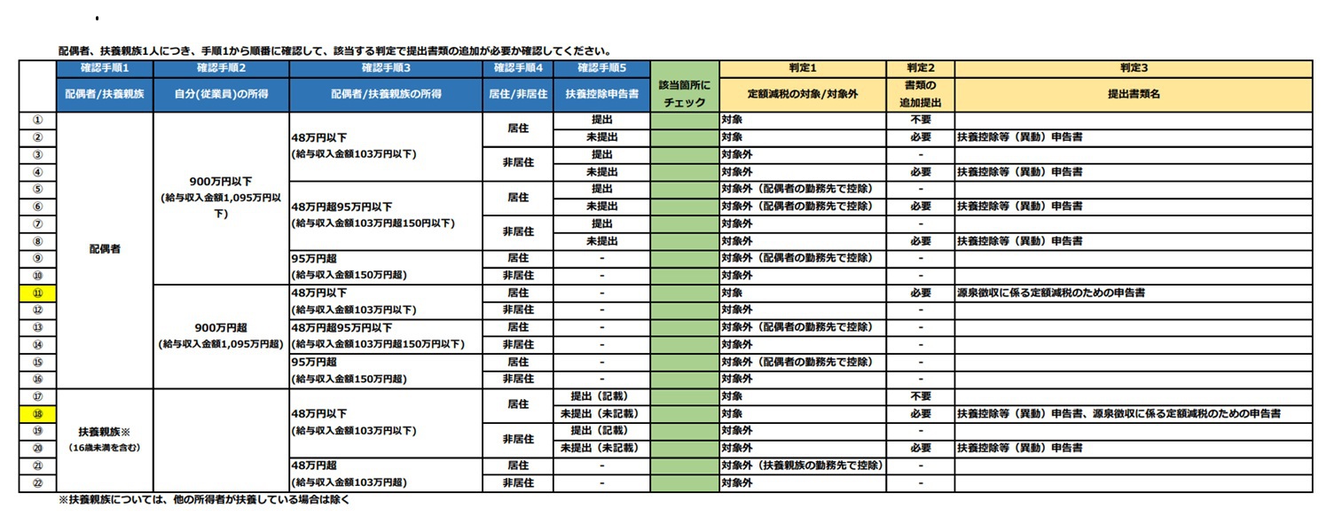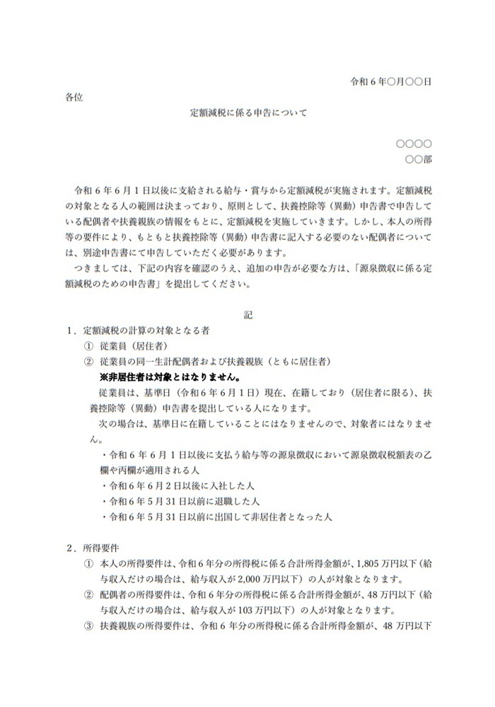 従業員配布用の案内文や定額減税対象者、提出書類を判別する定額減税対象者判定表など提供いたします。